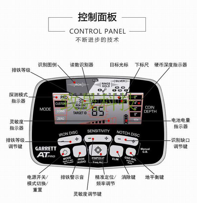 3.IRON AUDIO(鐵金屬音調開關):按下或松開鐵音頻按鈕,開啟或關閉鐵音頻功能。功能啟用時,顯示屏顯示“鐵音頻”字樣。鐵音頻功能可用于AT-PRO的六種模式中的任一種。地下散落的鐵物件會屏蔽一些正確的目標物,甚至產生“鬼鳴”。美國蓋瑞特特有的鐵音頻功能可以讓操作者分辨出鐵的聲音(正常情況下為無聲),從而避免誤挖非想要的目標物。通過鐵識別設定,鐵金屬的音頻也可以調節(jié)包括所有目標在內的中音調范圍。操作者可以通過設置關閉低音調的鐵金屬目標和中音調的目標,識別有價值的目標。
